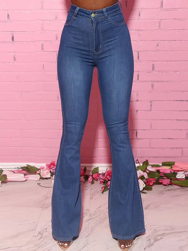 Plus Size High Waist Button Fly Flared Leg Jeans, Women's Plus Casual Solid Flared Leg Jeans