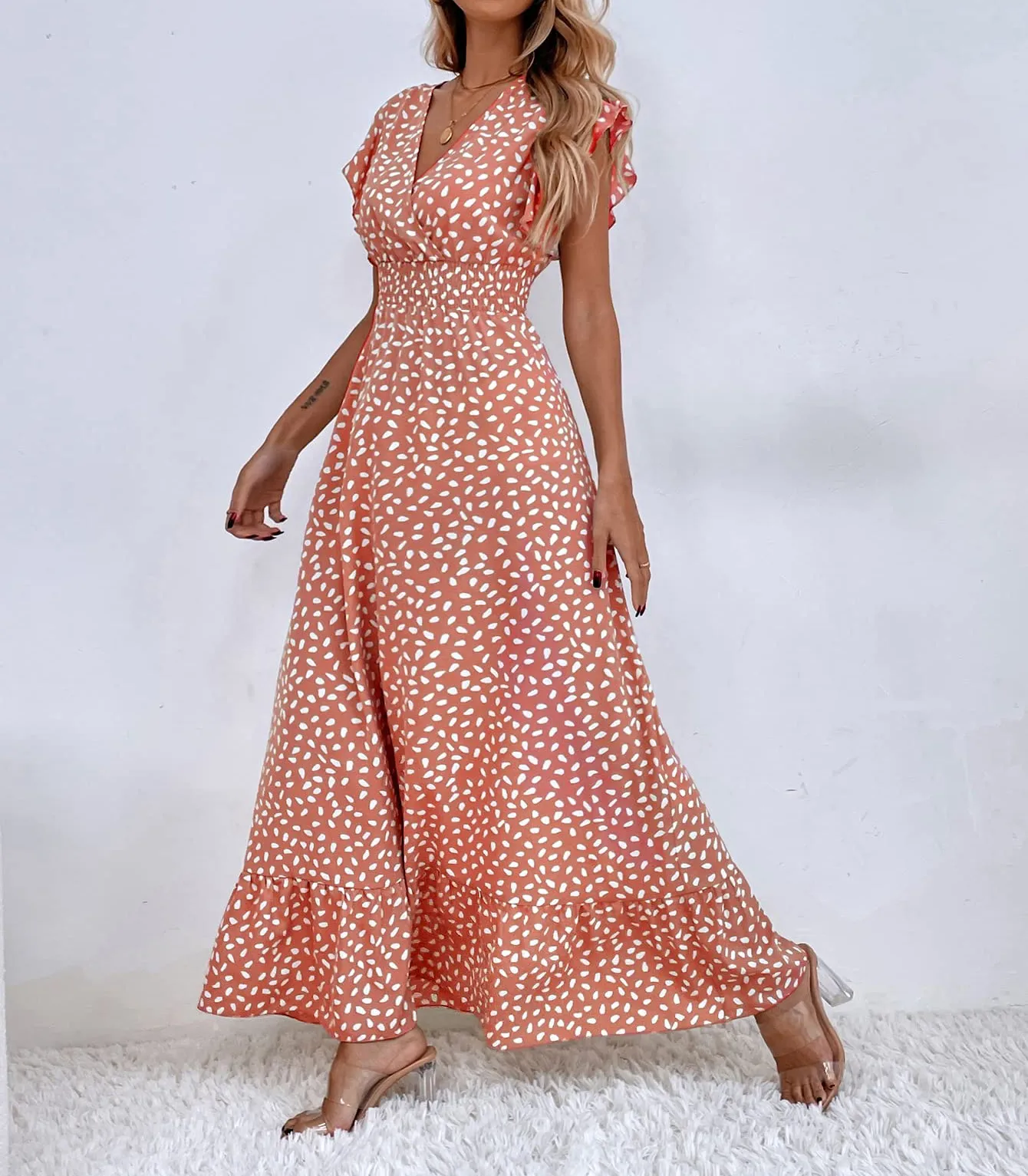 - Feature: cap sleeve, surplice neck, shirred waist, ruffle hem, printed, long length, vacation dresses for women