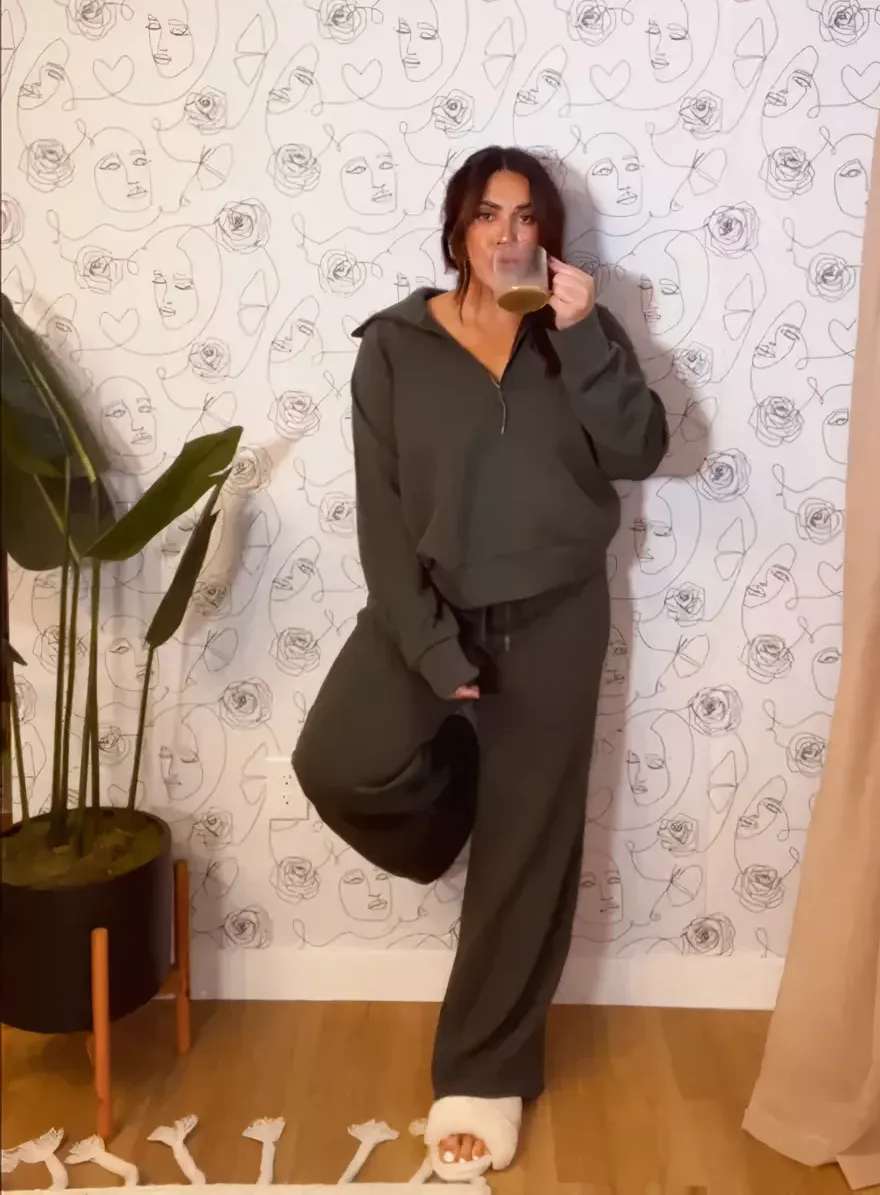 Are you looking for a comfortable suit that is both at home and suitable for going out? This solid color suit that touches the air is the perfect choice for you!