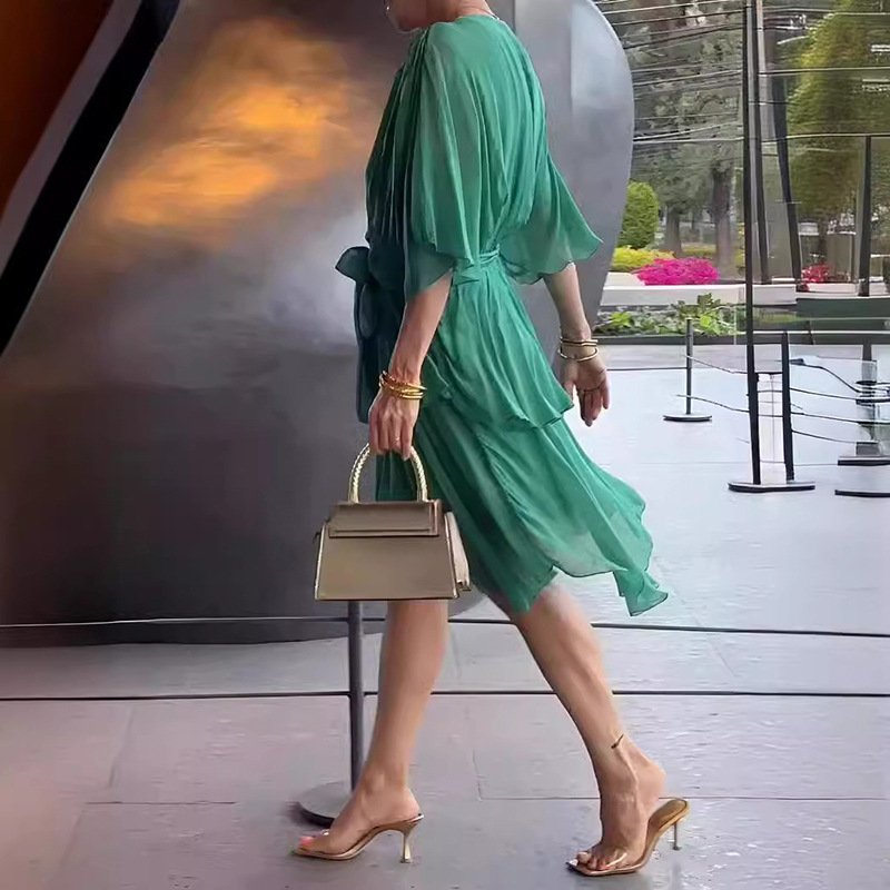 Features: This women's dress. With a comfortable V-neckline, long sleeves and a charming high-waisted design.
